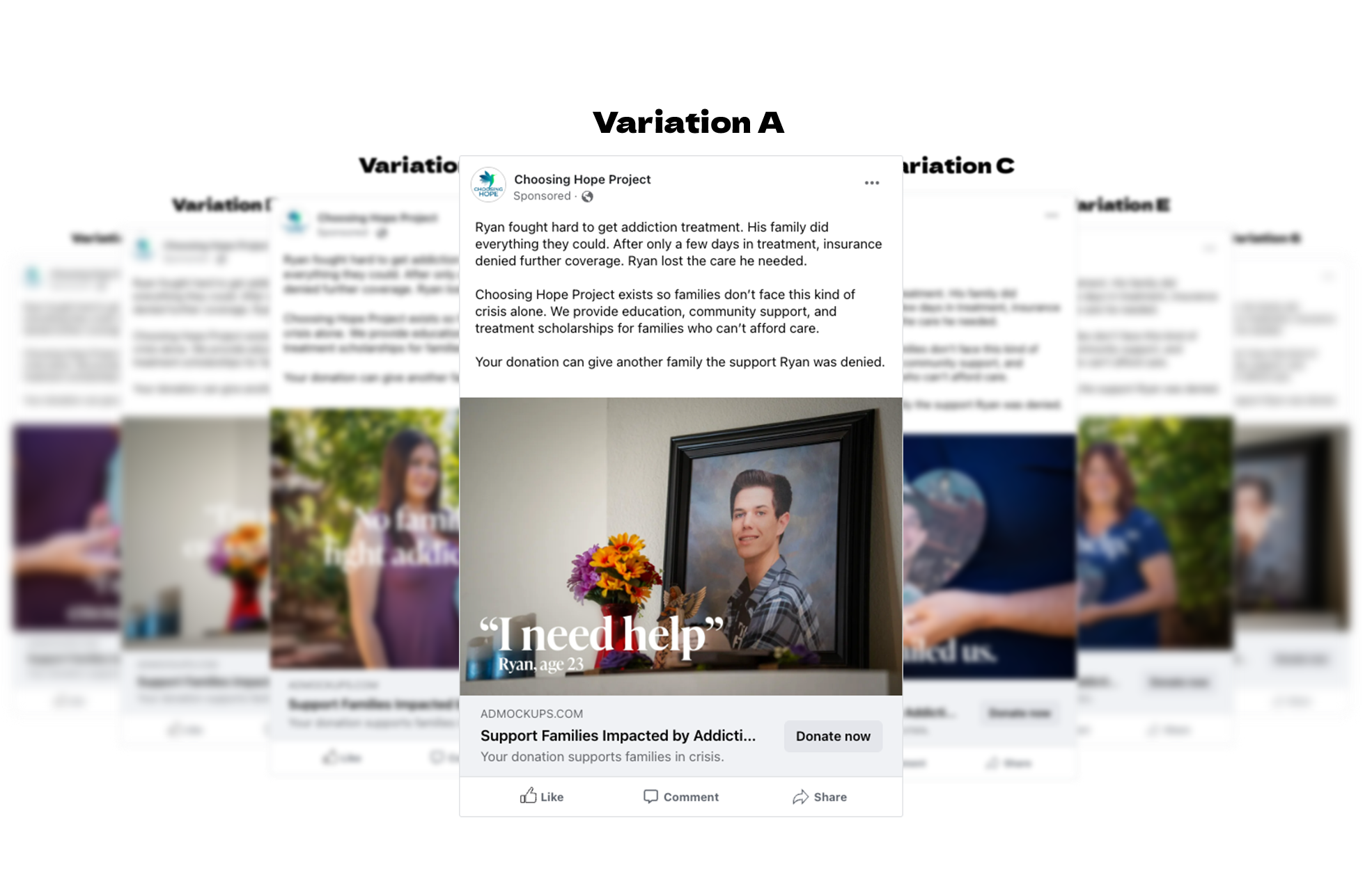 These variations explore emotional tone, headline impact, and how close-up portraits vs. contextual backgrounds influence engagement. The goal is to balance sensitivity with clarity in nonprofit messaging.